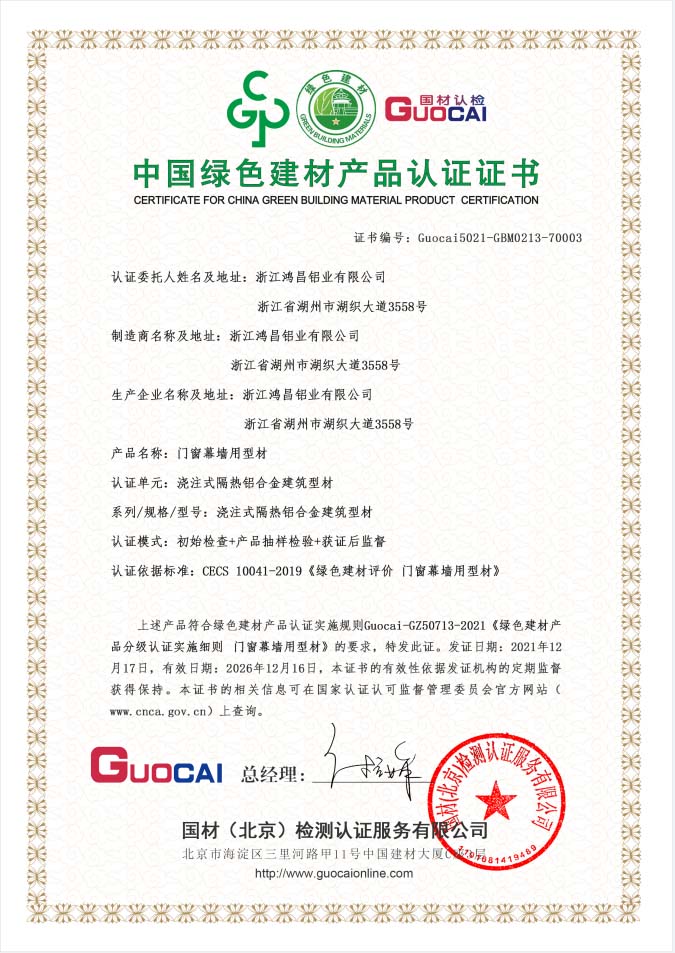 中國綠色建材產(chǎn)品認證證書-澆注式隔熱鋁合金建筑型材